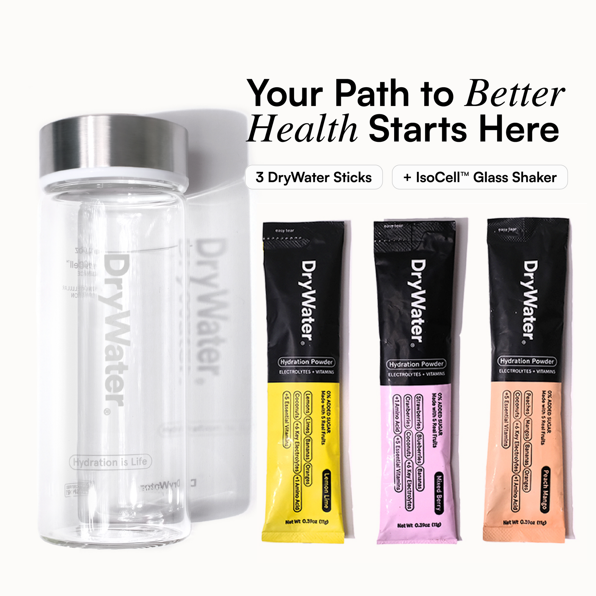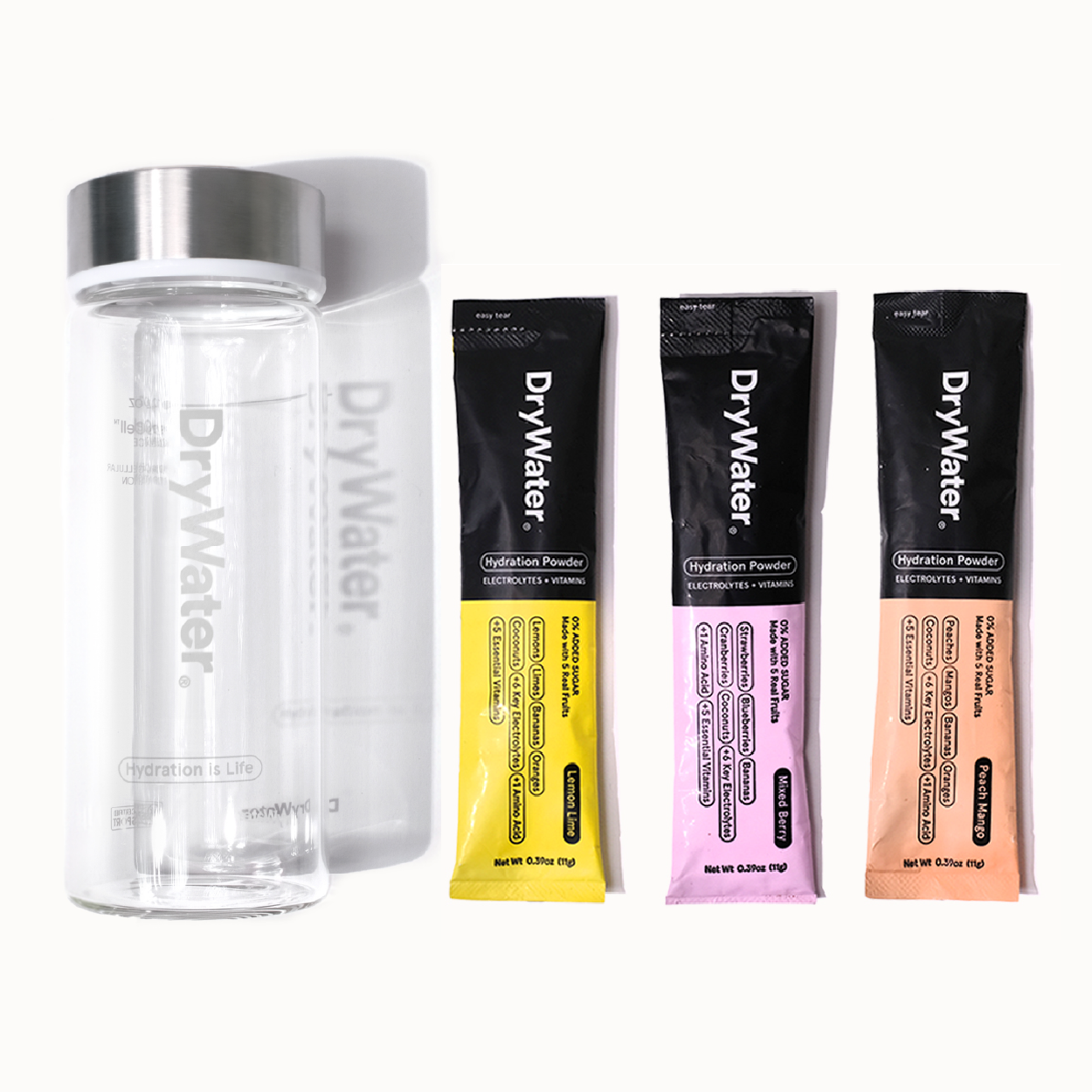 Everything! And yes, we truly mean everything, just as our team of doctors and scientists do. Every single serving stick of DryWater is infused with a comprehensive dosage of 24-26 ingredients (depending on the flavor) to ensure complete cellular hydration. This includes an unparalleled dosage of electrolytes and minerals, leading the industry. Coupled with a comprehensive essential vitamin profile and a vital amino acid for muscle recovery and optimal performance, DryWater stands out. Our mastery lies in crafting a delicious tasting blend of hydration powder by harnessing the essence of real fruits, extracting all the nutritional goodness such as fiber, antioxidants, nutrients, and vitamins.